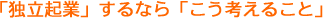 | @ 今までの経験が生かせる状態でスタートを切ること |  | 「脱サラ」して、退職金を頭金に独立起業。とよく言いますが、かなり成功率が低いのが現状です。また安定収益がなくなって、退職金を元手に運転資金にしてと考える方々も多いと思いますが、3ヶ月、いや6ヶ月分無収入で生活できる資金があれば独立起業できる。とも言いますが、それはあくまでも事業がうまく軌道に乗ることが前提の話です。保障はありません。だから仕事を好き嫌いで判断するのではなく、独立起業しても今までお世話になった会社にも少しは貢献し、取引先をある意味活用させていただくようなビジネスモデルで事業をはじめるのが得策です。 スタート時は、より可能性の高い道を選択すべきなのです。 | | A できるかぎり「顧客」がいる仕事をする |  | 「経営」=「顧客がいて成り立つもの」と考えてほぼ間違いないでしょう。お客様がいるから、企業は安定するのです。どの業界にもいるトップセールスの方々も常に新規開拓だけで、高い実績を継続させられているわけではなく、ほとんどが「お客様」がいるから、常に好成績を維持出来ているのです。これを「独立起業」に置き換えると、独立起業当初から多くの顧客がいる場合はめったにない。だから、不安定でも仕方がない。だから何をするのか?取引先やお客様を作ることから、「起業」は始まるのです。 「仕事」=「顧客作り」と言っても過言ではありません。したがって、起業当初から自分を好意にしていただける「顧客」がいるに越したことがないのです。 | | B 景気が低迷している時(業界)に起業する |  | 景気が良い時は、資金力がある大手企業が参入してくる場合がほとんどで、資金力がない弱小企業は、スタートラインにたっても軌道に乗せるのに非常に時間がかかってしまいます。 「ピンチの時こそ、チャンス有り」この精神で、独立起業のチャンスを逃さずスタートを切る。ビジネスは、「世の中の動きに反して考えること」に成功があるのです。 |